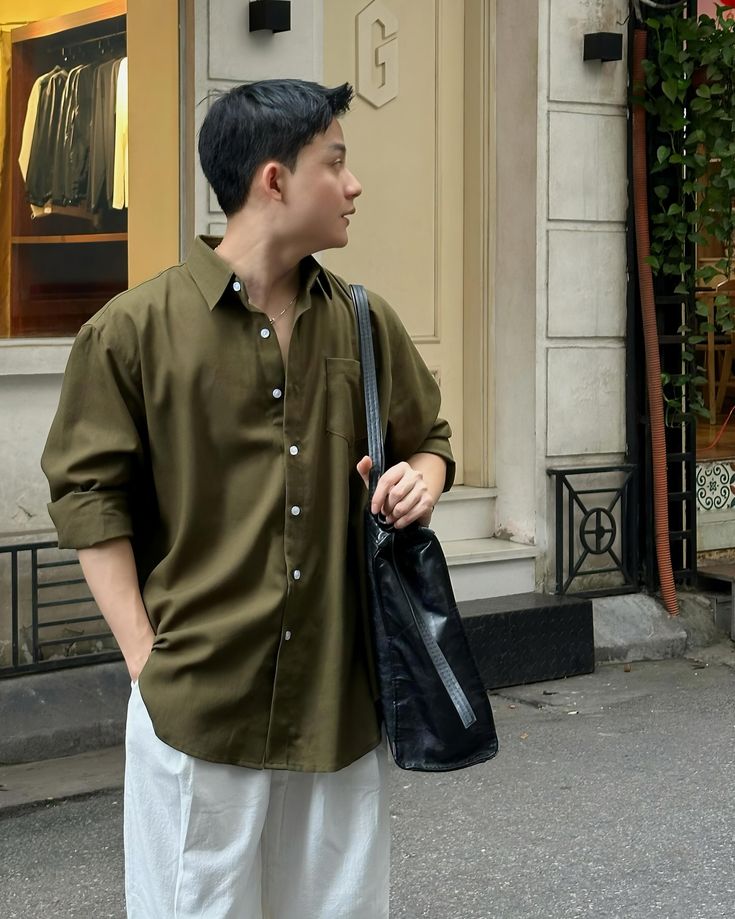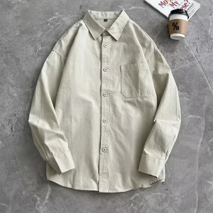 Japanese Utility Shirt Men’s | Long Sleeve Oversized Streetwear Casual Top – Beige Workwear Blouse W/ Chest Pocket