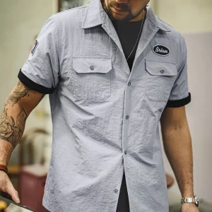 Maden Retro Toretto Short-sleeved Shirt Dark Gray Embroidered Design Lapel Thin Solid Shirt for Men’s Summer Tops