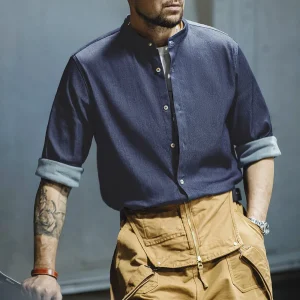 Maden Retro Cool Ice Silk Denim Shirt with Washed Round Neck Casual Solid Color Long-sleeved Shirt for Men’s Autumn