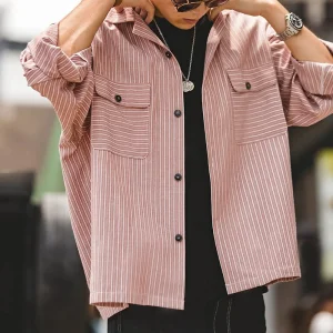Maden Vintage Men’s Striped Cuban Collar Shirts with Pockets Long-sleeved Blouses for Spring and Fall Versatile Trend Tops